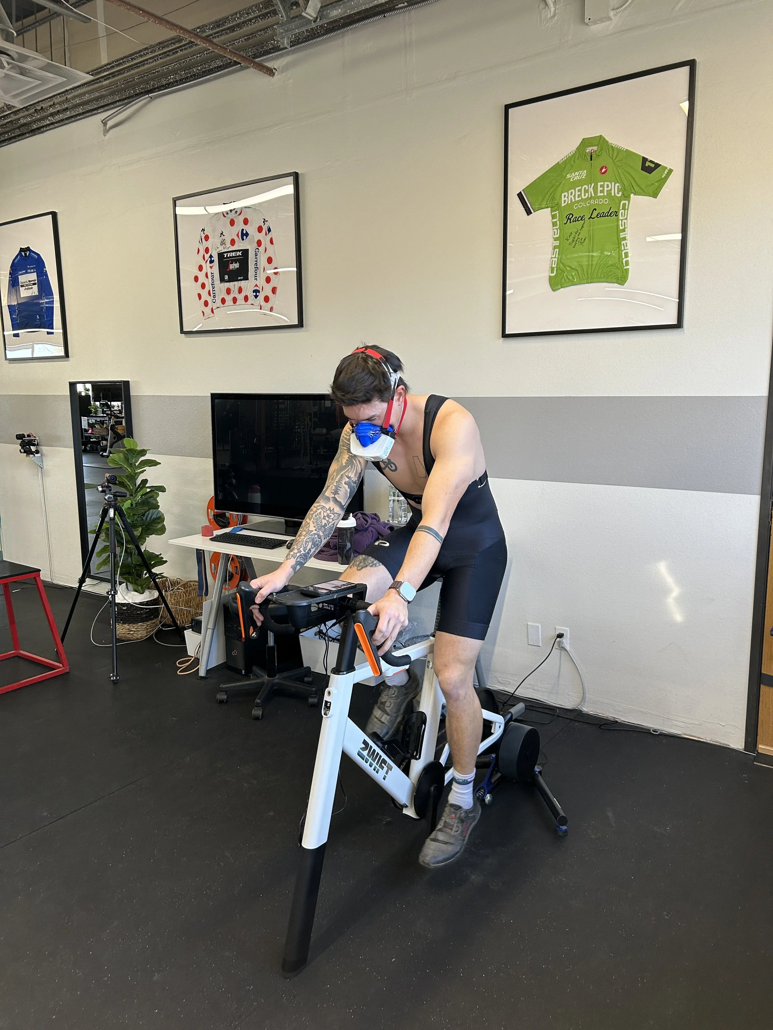This test is done with the mask you see above. This is measuring the air as you inhale and exhale, allowing us to measure a wide range of metrics as it relates to your health and wellness. We prefer to do this test on a treadmill if you run or on a bike trainer if you are a cyclist. The test is short, approximately 20 minutes, but difficult in intensity.